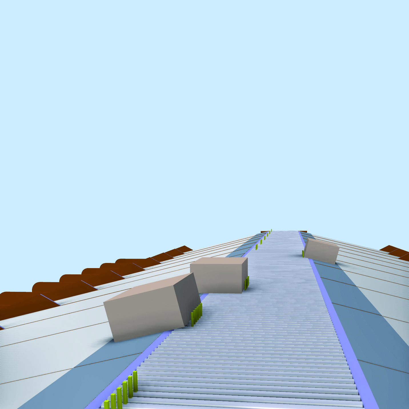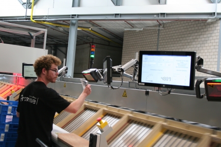 Die Produkte werden auf separaten Transportbändern platziert, die senkrecht zum Sortierstrom verlaufen. Das Band bewegt sich nach links oder rechts, um das Produkt an den richtigen Ort abzugeben. Die Transportbänder werden mechanisch angetrieben.
